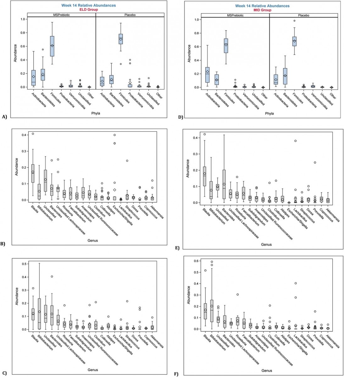 Số lượng Bifidobacterium (thuộc ngành Actinobacteria) đều tăng đáng kể về mặt thống kê sau 12 tuần sử dụng MSPrebiotic® so với nhóm ELD và MID sử dụng giả dược [3]
