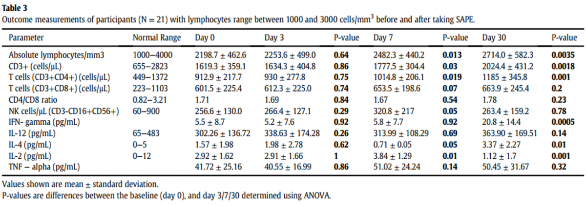 Kết quả nghiên cứu của M. Rajanna và cộng sự cho thấy SAPE làm tăng tổng lượng tế bào T ở người, đặc biệt tăng tế bào trợ giúp T hỗ trợ (T CD3+, T CD4+), tăng nhẹ T CD8+ và đồng thời tăng nồng độ cytokin IFN- γ, IL-4 (hai cytokine này đóng một vai trò quan trọng trong sự biệt hóa sớm của các tế bào Th1 và Th2 ở người) và giảm nồng độ IL-2 ở ngày 30 so với ban đầu. Nghiên cứu cũng quan sát không có tác dụng phụ nào liên quan sau khi uống SAPE trong 30 ngày.