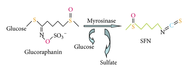 Sulforaphane là sản phẩm thủy phân của glucoraphanine dưới xúc tác của enzyme myrosinase có trong tế bào rau Cải. Theo nghiên cứu thì hàm lượng sulforaphane trong giai đoạn mầm cao hơn gấp 20- 50 lần so với giai đoạn sinh trưởng và thu hoạch.