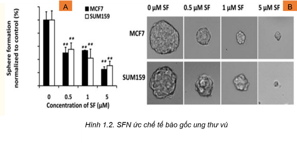 Trong ống nghiệm, cho 2 dòng tế bào gốc MCF7 và SUM159 tiếp xúc với các nồng độ khác nhau của sulforaphane, sau đó nuôi cấy và quan sát sư thay đổi. Như kết quả trong Hình 1.2 bên dưới, sulforaphane không chỉ làm giảm số lượng tế bào gốc từ 45% - 75% (Hình 1.2A), mà còn giảm kích thước tế bào từ 8 - 125 lần (Hình 1.2B).