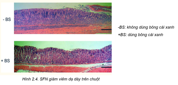 Đồng thời, SFN còn giúp giảm tình trạng viêm dạ dày ở những bệnh nhân bị nhiễm HP. Trong thử nghiệm in vivo trên chuôt, việc bổ sung mầm bông cải xanh bằng đường uống với liều 3 μmol/chuột/ngày làm giảm đáng kể viêm dạ dày ở chuột.