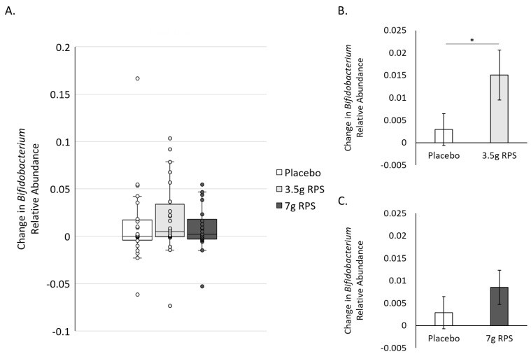 Một thử nghiệm lâm sàng của Jason R Bush và công sự (2024) được tiến hành ngẫu nhiên, mù đôi, có đối chứng giả dược gồm ba nhóm đã được tiến hành để đánh giá tác dụng của liều 3,5 g và 7 g tinh bột khoai tây kháng Solnul ™ hàng ngày (RPS) đối với quần thể vi khuẩn đường ruột có lợi và độ đặc của phân sau thời gian 4 tuần. Kết quả cho thấy ở nhóm sử dụng 3,5 và 7g tinh bột kháng mỗi ngày làm tăng đáng kể mức độ Bifidobacterium và Akkermansia và làm giảm nhu động ruột liên quan đến tiêu chảy và táo bón so với giả dược, đáp ứng các tiêu chí đồng thuận của Hiệp hội khoa học quốc tế về Probiotics và Prebiotics (ISAPP) về định nghĩa của prebiotic [1].